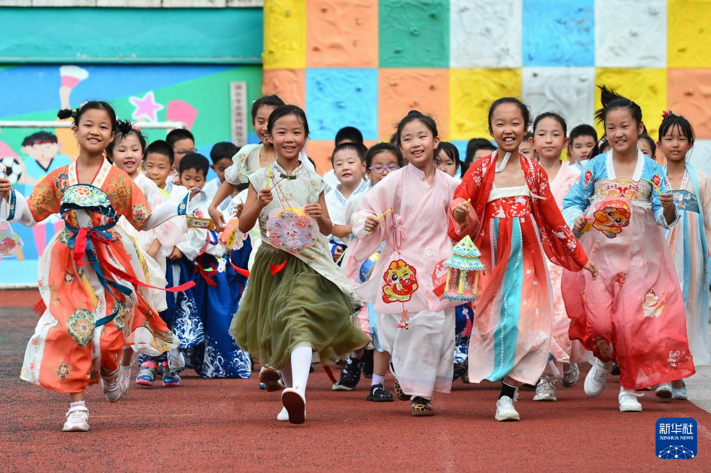9月13日,在山东青岛宜阳路小学开展的“多彩民俗迎中秋”主题活动上,孩子们手提花灯巡游。