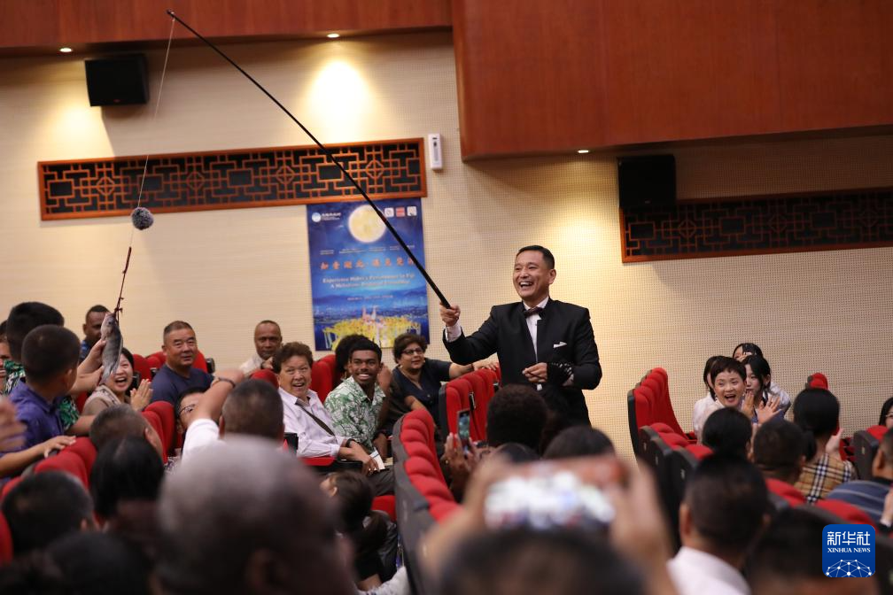 9月17日,在斐济苏瓦市政厅,演员在“知音湖北·遇见斐济——天涯共此时中秋晚会”上表演魔术时与现场观众互动。新华社发(桑钦龙摄)
