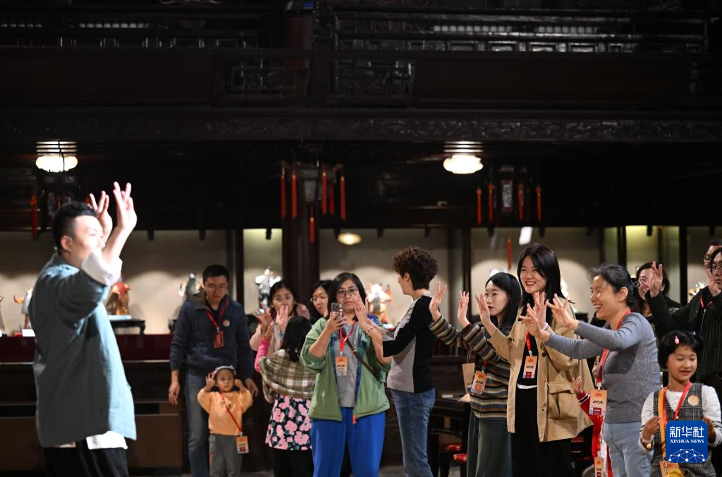 11月2日,观众在模仿戏曲动作以获取相应游戏奖励。