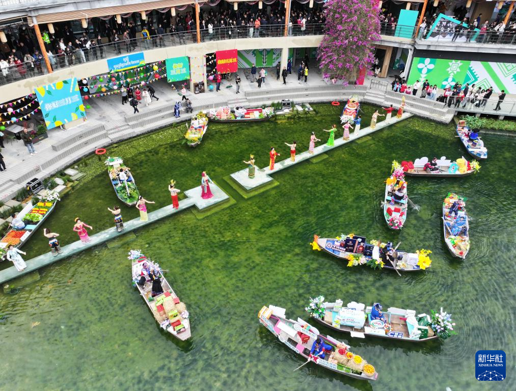 这是3月29日拍摄的广西南宁园博园“三月三”巡游(无人机照片)。新华社记者 周华 摄