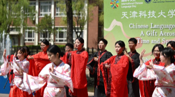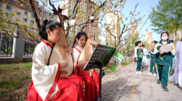 4月19日晚,演员在天津津湾广场亲水平台为市民游客演出。
