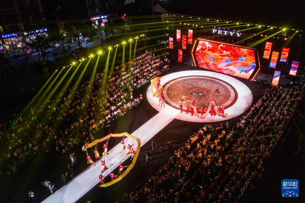 这是5月7日在古镇音乐时装秀上拍摄的传统舞龙表演(无人机照片)。