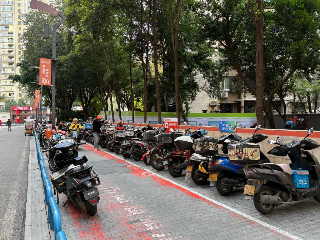 石油路街道因拥有大型商业综合体,日均集聚外卖骑手、快递员等新就业群体约2200人,人车混行是个“老问题”。为此,街道在商圈核心区域打造了“人车分流”示范治理空间,设置骑手专属通道,配套“共享换电驿站”。