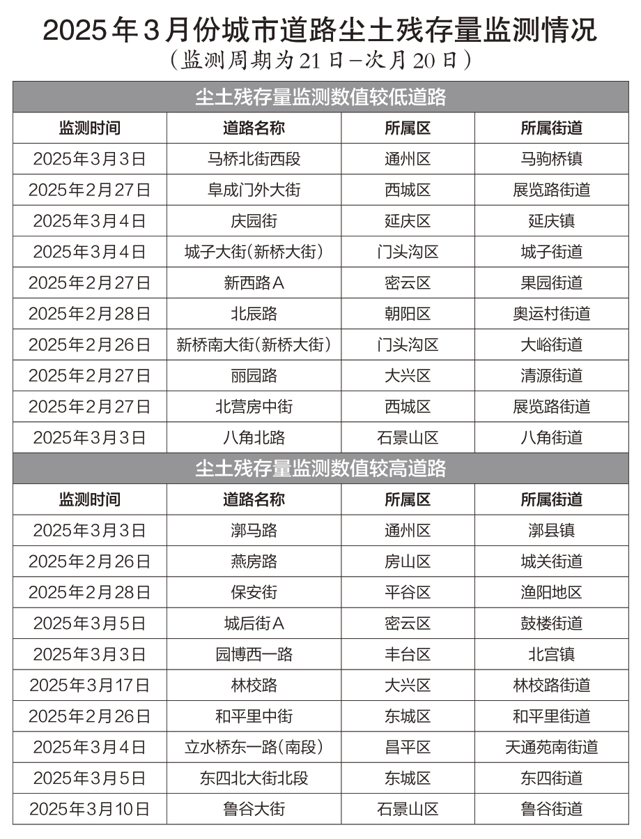 其中,各区一级道路均值为6.90克/平方米,二级道路均值为8.60克/平方米,环路(二三四环)均值为6.80克/平方米,跨区快速路(广渠路、阜石路等)均值为6.30克/平方米,城市道路尘土残存量在标准以内并稳中有降,道路扬尘得到有效控制。