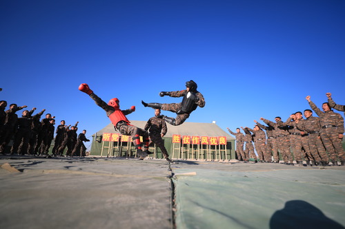 ????武警新疆總隊某機動支隊特戰(zhàn)一中隊組織官兵開展搏擊訓(xùn)練(10月31日攝)。新華社發(fā)(張文 攝)
