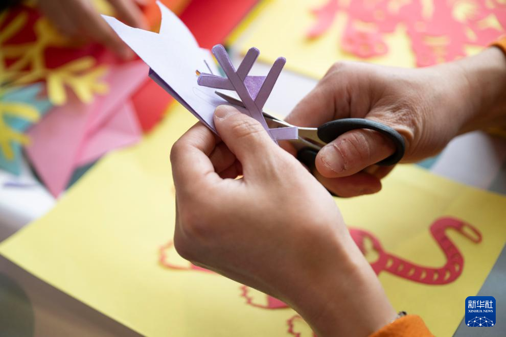 11月26日,游客在Y783次“悠享龙江·银旅号”旅游列车上体验剪纸。