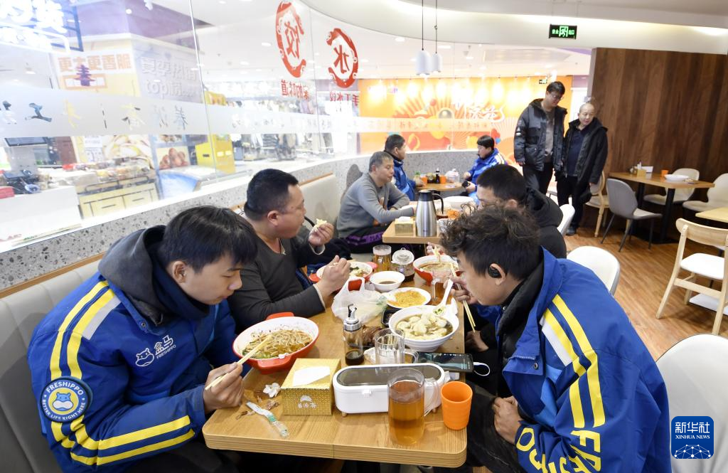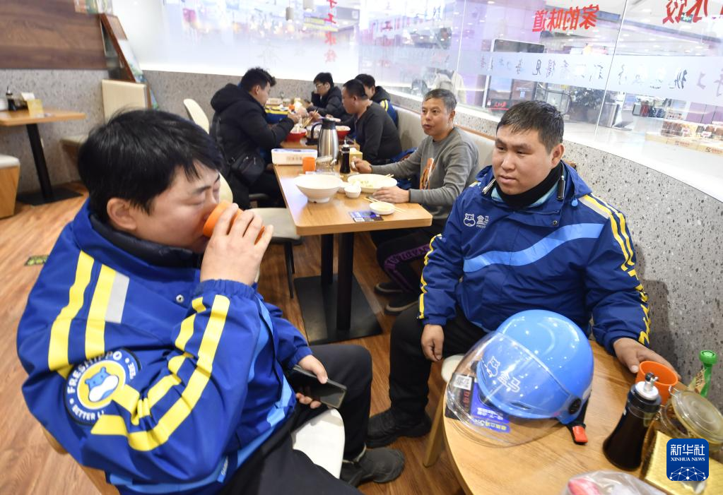11月26日,几名外卖配送员在东城区崇文门外街道一家为他们提供优惠餐饮的爱心饺子馆吃饭。