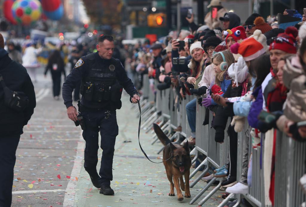11月27日,在美国纽约,警察携带警犬在感恩节游行活动现场值守。