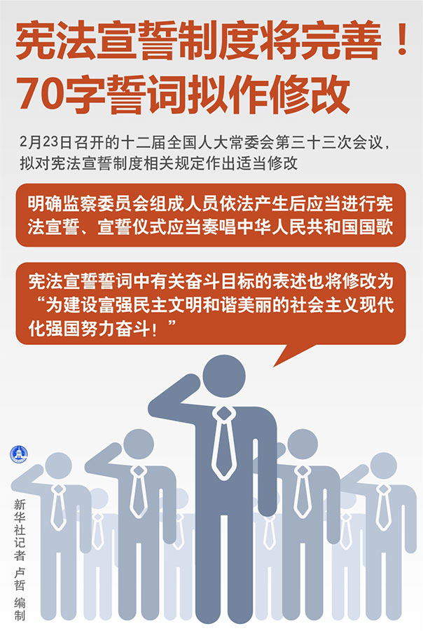 新華社北京2月23日電(記者陳菲、王琦)23日召開的十二屆全國人大常委會第三十三次會議,擬對憲法宣誓制度相關(guān)規(guī)定作出適當(dāng)修改,明確監(jiān)察委員會組成人員依法產(chǎn)生后應(yīng)當(dāng)進(jìn)行憲法宣誓、宣誓儀式應(yīng)當(dāng)奏唱中華人民共和國國歌。憲法宣誓誓詞中有關(guān)奮斗目標(biāo)的表述也將修改為“為建設(shè)富強(qiáng)民主文明和諧美麗的社會主義現(xiàn)代化強(qiáng)國努力奮斗!”