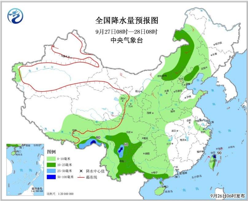 圖1 全國降水量預(yù)報圖(9月26日08時-27日08時)