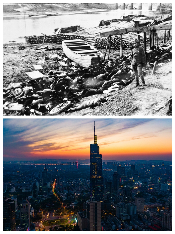 上圖為1937年12月中旬,日本侵略軍攻占中國南京后,對中國老百姓進行了空前的慘無人道的大屠殺。在南京城西一條流往長江的小河邊,被日本侵略軍殺害的中國人,尸體遍地血流成河。