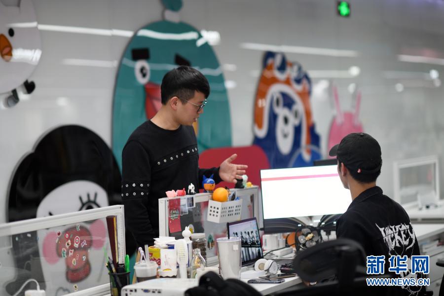 11月10日,美圖公司創始人兼CEO吳欣鴻(左)與公司同事交流。新華社記者 金良快 攝