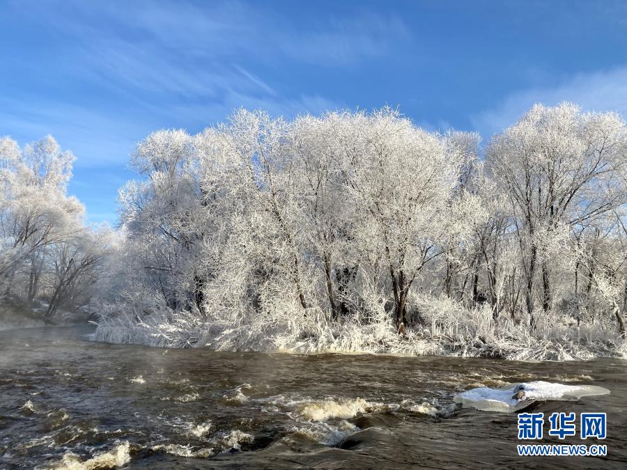 遜克縣位于黑龍江省北部,冬季漫長而寒冷。當地庫爾濱水電站放水時,水遇冷形成霧氣,落到樹枝上凝結成霜花,在平臺村周邊形成綿延的霧凇景觀。