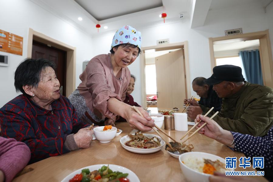 10月22日,西寧市城西區(qū)溫馨陽光托老所內,護理員張蓉霞(左二)在用公筷為老人們夾菜。新華社記者 吳剛 攝