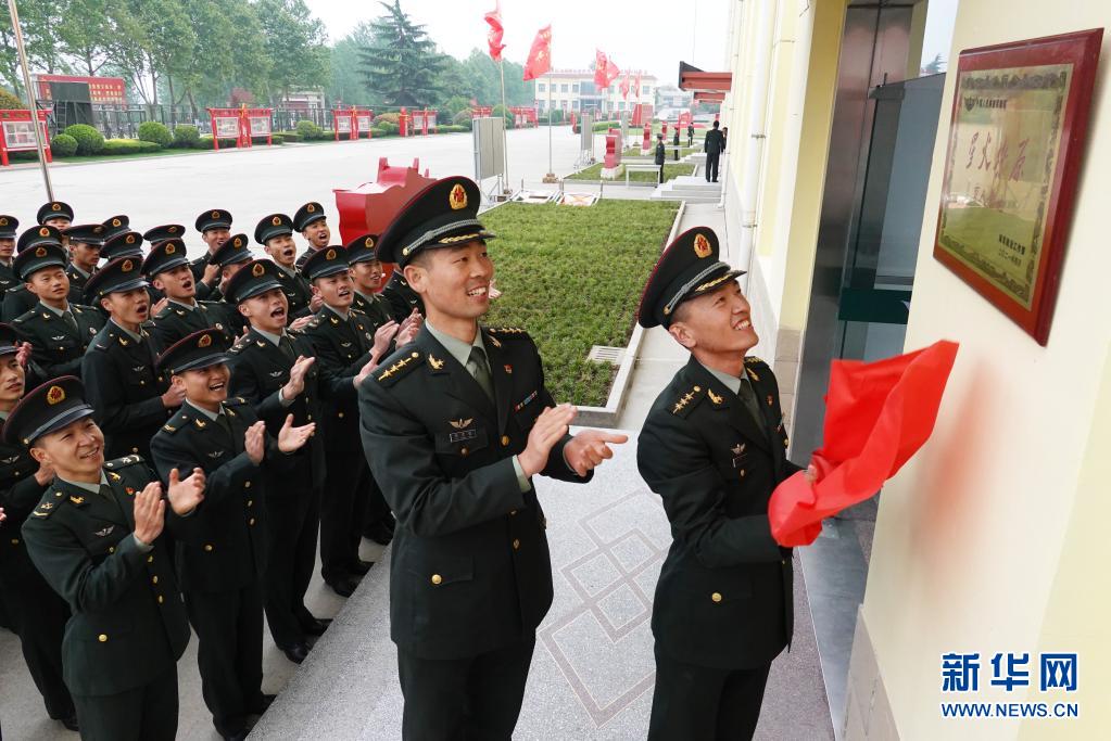 陸軍第83集團軍某旅“紅一連”官兵在連隊門前懸掛“星火燎原”育人基地牌匾(4月23日攝)。新華社記者 張永進 攝