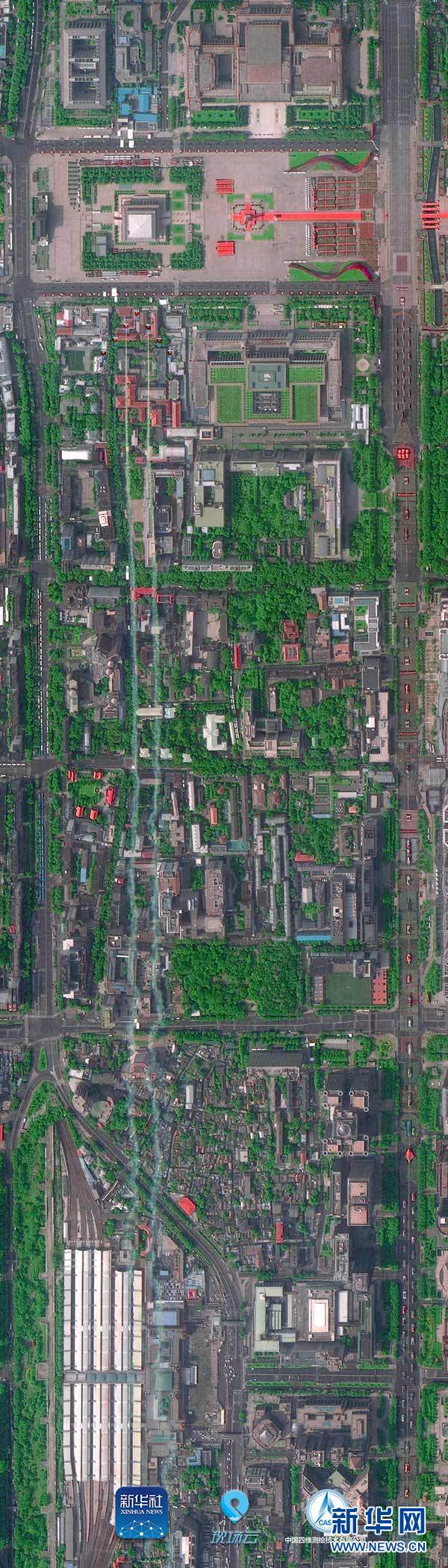 這是“高景1號”拍攝的拉出彩煙的空中梯隊(duì)即將通過天安門廣場上空(10月1日攝)。 10月1日上午,慶祝中華人民共和國成立70周年大會在北京天安門廣場隆重舉行。新華社聯(lián)合多家單位調(diào)用多顆國產(chǎn)衛(wèi)星俯瞰閱兵,從“最高機(jī)位”發(fā)回這三張珍貴的長安街全畫幅衛(wèi)星圖。 新華社發(fā)(中國四維測繪技術(shù)有限公司提供)