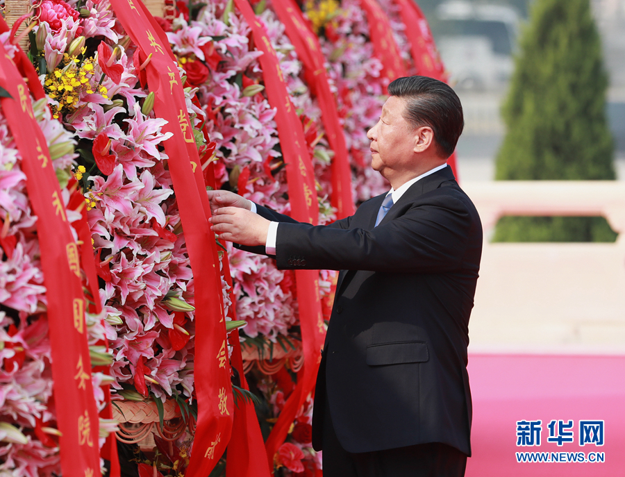 9月30日上午,習(xí)近平、李克強(qiáng)、栗戰(zhàn)書、汪洋、王滬寧、趙樂際、韓正、王岐山等黨和國(guó)家領(lǐng)導(dǎo)人來(lái)到北京天安門廣場(chǎng),出席烈士紀(jì)念日向人民英雄敬獻(xiàn)花籃儀式。這是習(xí)近平整理花籃上的緞帶。 新華社記者 龐興雷 攝