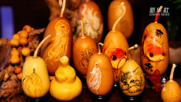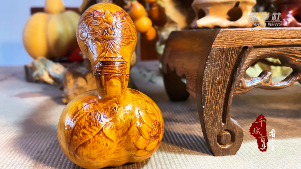 葫芦砑花又称“押花”,起源于清代,以砑、压、挤、按等手法,在不破坏葫芦表皮的前提下,塑造出凹凸有致的浮雕图案。作品精美且能长久保存,具有独特的艺术价值。