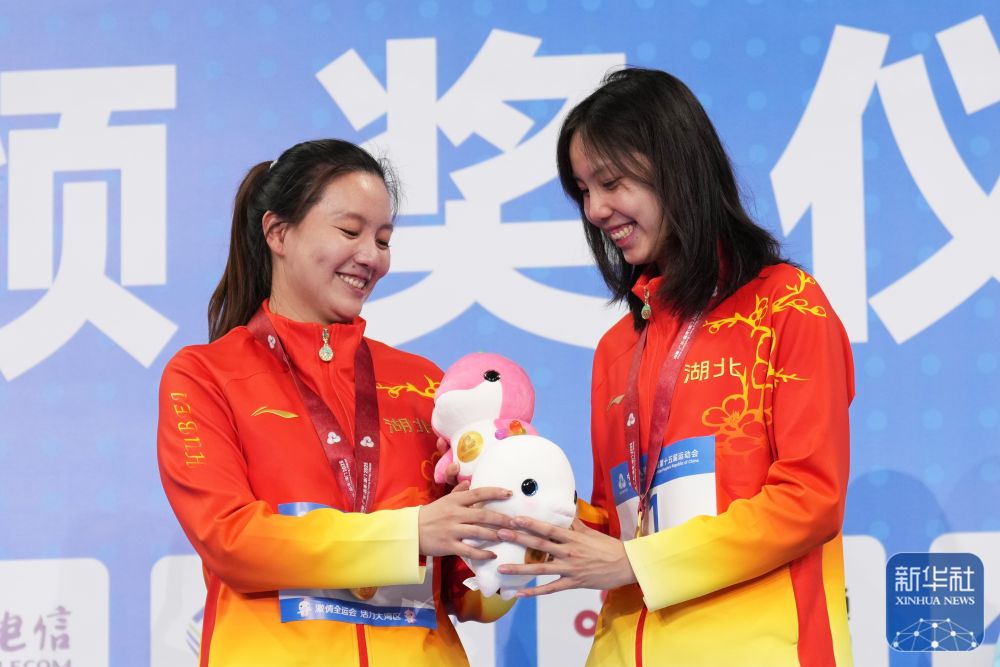 ↑获得冠军的湖北队选手彭旭玮(右)在颁奖仪式后。新华社记者 杜宇 摄