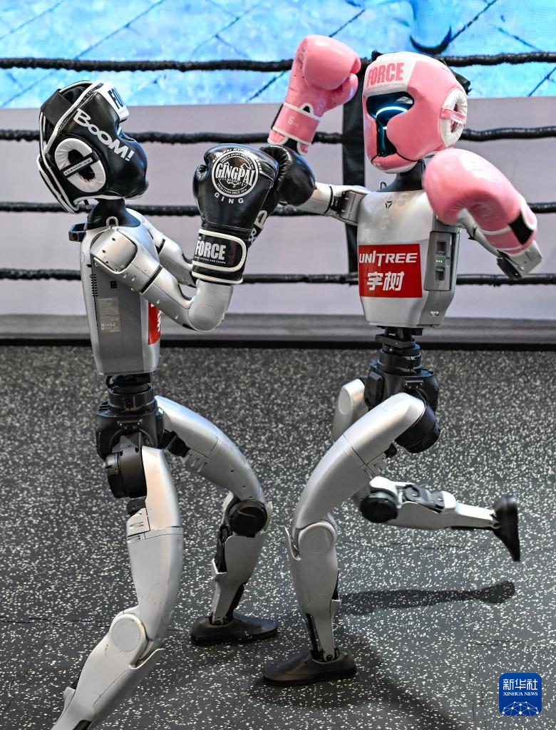 这是9月4日在2025世界智能产业博览会宇树科技展厅拍摄的机器人拳击赛现场。