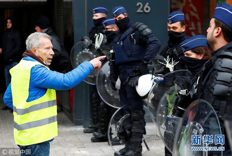 當?shù)貢r間12月15日,比利時布魯塞爾,當?shù)乇l(fā)“黃背心”抗議活動。 (圖片來源:視覺中國)