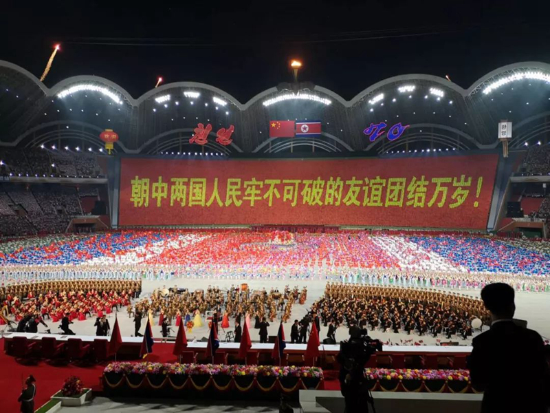 演出在以“朝中友誼萬古長青”為主題的大型歌舞表演中結(jié)束。習(xí)近平和金正恩同全場觀眾一起站立,為藝術(shù)家和演員們的精湛表演送上經(jīng)久不息的掌聲。