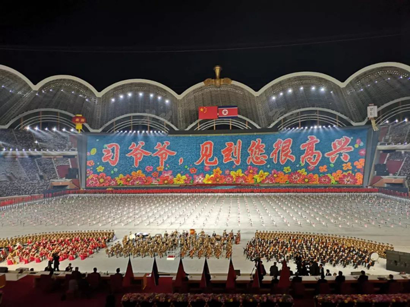 這臺演出為習(xí)近平此訪專門精心創(chuàng)作,數(shù)萬名朝鮮演員參加表演,朝鮮三大樂團首次同臺獻藝,整場演出氣勢恢宏、震撼感人。