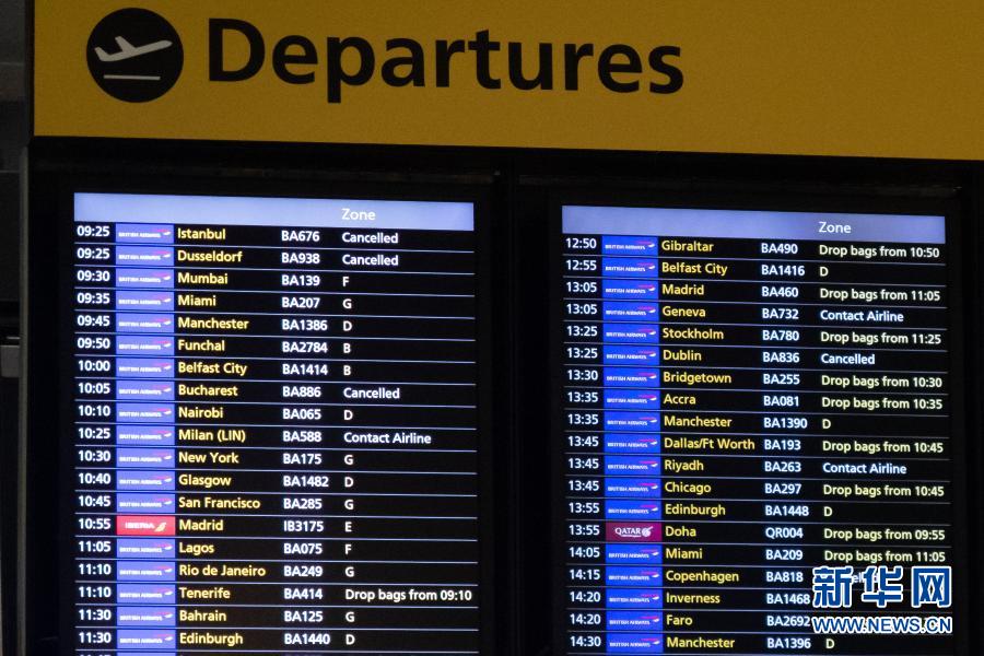 12月21日,英國倫敦希思羅機場第五航站樓內(nèi)顯示多趟航班被取消。新華社發(fā)(蒂姆·愛爾蘭攝)