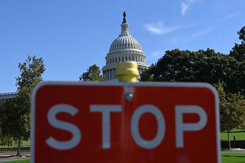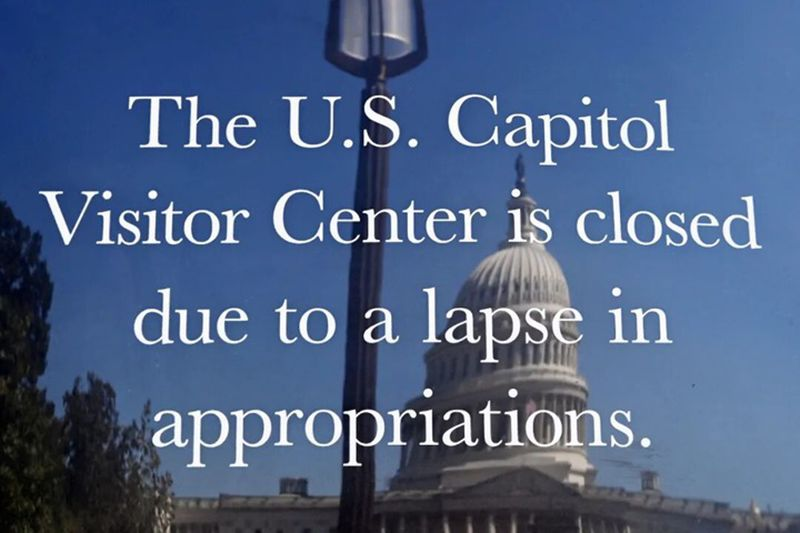 10月1日,在美国华盛顿的美国国会大厦前,公告牌显示国会大厦游客中心因美国联邦政府“停摆”而关闭。新华社记者 李睿 摄